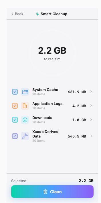 Scans system caches, app logs, downloads, and developer data. Pick what to clean and reclaim gigabytes with one click.